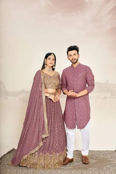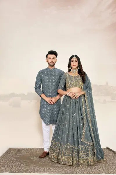 Matching Couple Indian Outfit Georgette Silk Lehenga Choli with Kurta Pajama Set