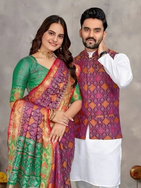 Couple Combo of Mens Kurta Pajama with Koti and Womens Jacquard Silk Saree Ideal for Dealers