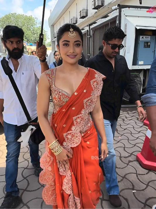 Bollywood Celebrity Inspired Yellow & Red Georgette Saree – Stylish Designer Party Wear Look