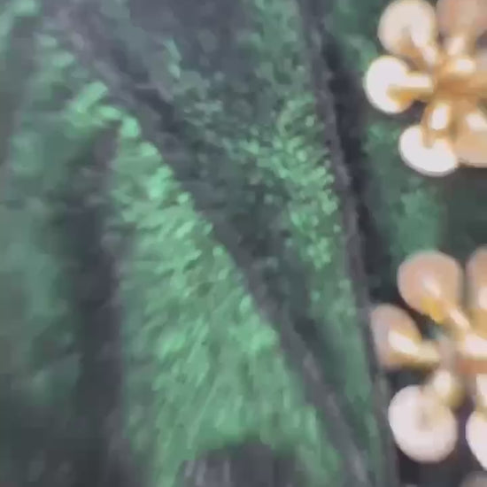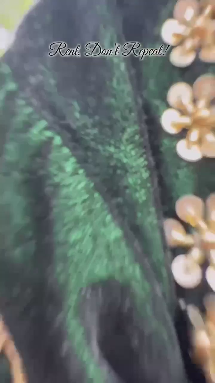 Premium green velvet lehenga with heavy thread & sequence work, 4.5m flair, semi-stitched, fits up to size 44. Perfect for weddings and parties.