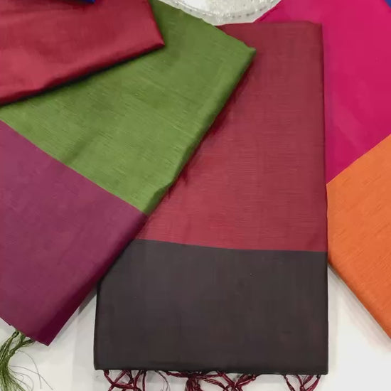 Available in stunning dual-tone shades like magenta-mustard, black-red, green-pink, maroon-olive, and blue-green, each saree showcases elegant borders and tassel pallus that reflect timeless Indian craftsmanship.